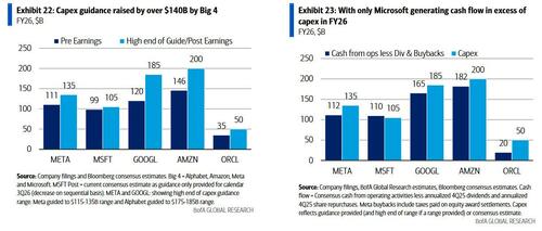 Selvom der er debat om, hvorvidt Meta udsteder gæld før eller senere (spoiler alert: det bliver før), bemærker BofA, at for at opnå en positiv nettogæld skal Meta bruge likviditet hurtigere, end det genererer eller rejser det. Så hvis det udsteder på kort sigt, vil det være mindre sandsynligt, at det vil udstede på mellemlang sigt. Netto kontantgenerering er stadig betydelig for Microsoft ifølge konsensusestimater. En løsning er, at omsætningsvæksten accelererede for de fleste, men det store spørgsmål er, om omsætningsvæksten vil overstige den massive vækst i capex. Juryen er stadig ude, men som nedenstående grafer viser, er det i øjeblikket kun Microsoft, der vil generere en pengestrøm, der overstiger capex i 2026. Det betyder, at der slet ikke er nogen likviditet (fra driften) tilbage til tilbagekøb , og eventuelle aktietilbagekøb skal finansieres gennem mere gæld.