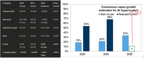 Der var hørbare chok-gisp i løbet af de sidste to uger, da først Alphabet og derefter Meta og Amazon afslørede investeringsplaner for 2026, der blæste forventningerne væk. Det var ikke kun dem: hele hyperscaler-komplekset (AMZN, GOOGL, MSFT, META) forudsagde en investeringsforventning for 2026 på svimlende 650 mia. dollars … og hvis man medregner ORCL og CRWV, stiger det til 740 mia. dollars …