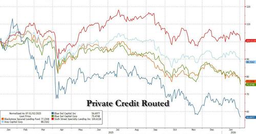 Efterhånden som fortællingen udviklede sig, faldt et BDC-aktieindeks med 4,6 % i sidste uge (se ” Private Credit Stocks Crash After Shock Reveals Huge Exposure To Collapsing Software Sector “)…
