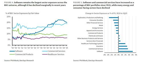 Og som vi først påpegede for en uge siden, har børsnoterede private kreditudbydere også omfattende eksponering mod software, hvor branchen i gennemsnit tegner sig for over 20 % af porteføljerne, ifølge en note fra Barclays.