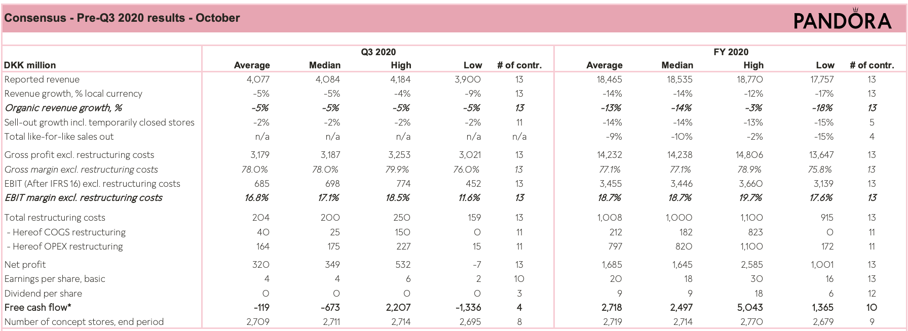 Kommentar: Analytikerne forventer et “profit” på 320 mio. kr. i Q3-20. Dette skal ses i forhold til et “profit” på -119 mio. kr. i Q3-19. Det er på trods af Corona-nedlukning. Husk på at Pandora opjusterede forventningerne til Q3 og 2020 tilbage i august.