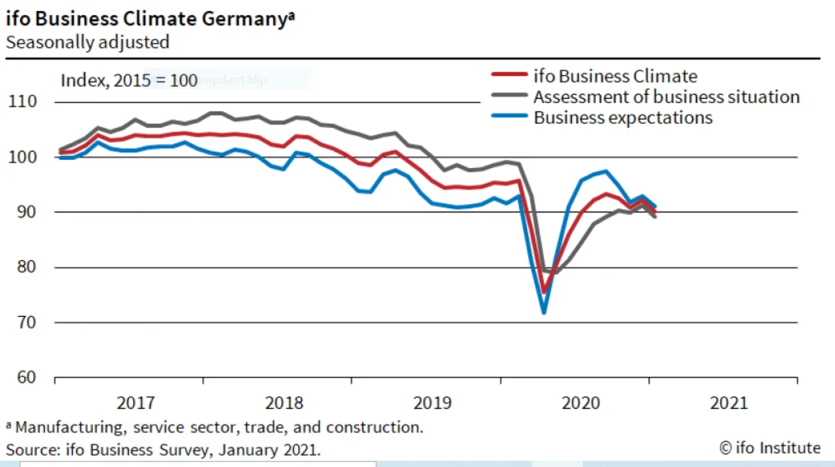 Ifo-indekset for januar viser igen tilbagegang i det tyske erhvervslivs forventninger og i vurderingen af den aktuelle situation. Indekset faldt til 90,1 mod 92,1 point i december. Faldet var det kraftigste siden april. Det signalerer en skarp reaktion på den lockdown, der blev indført før jul, og som for nylig blev forlænget til midten af februar. Der er dog formodninger om, at Tyskland undgik en double-dip i 4. kvartal. Den ekstremt langsomme udrulning af vacciner har også skærpet den negative stemning.