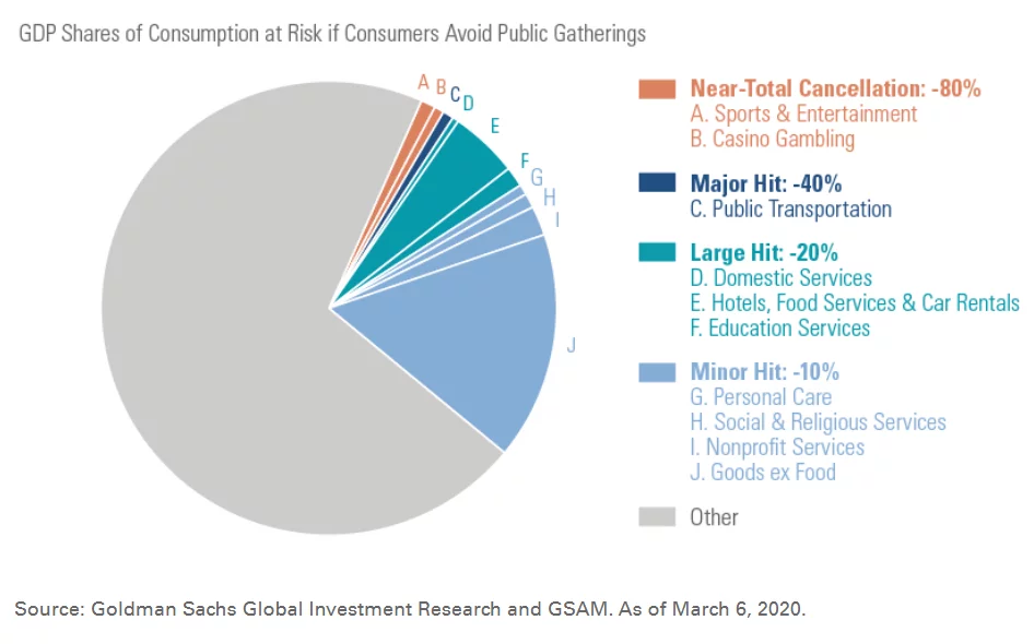 En tredjedel af den amerikanske økonomi går i stå, hvis forbrugerne undlader at mødes i det offentlige rum, herunder i butikscentre, vurderer Goldman Sachs. Men stor forskel på de ramte sektorer. At være selektiv har også i denne situation betydning for investorer.