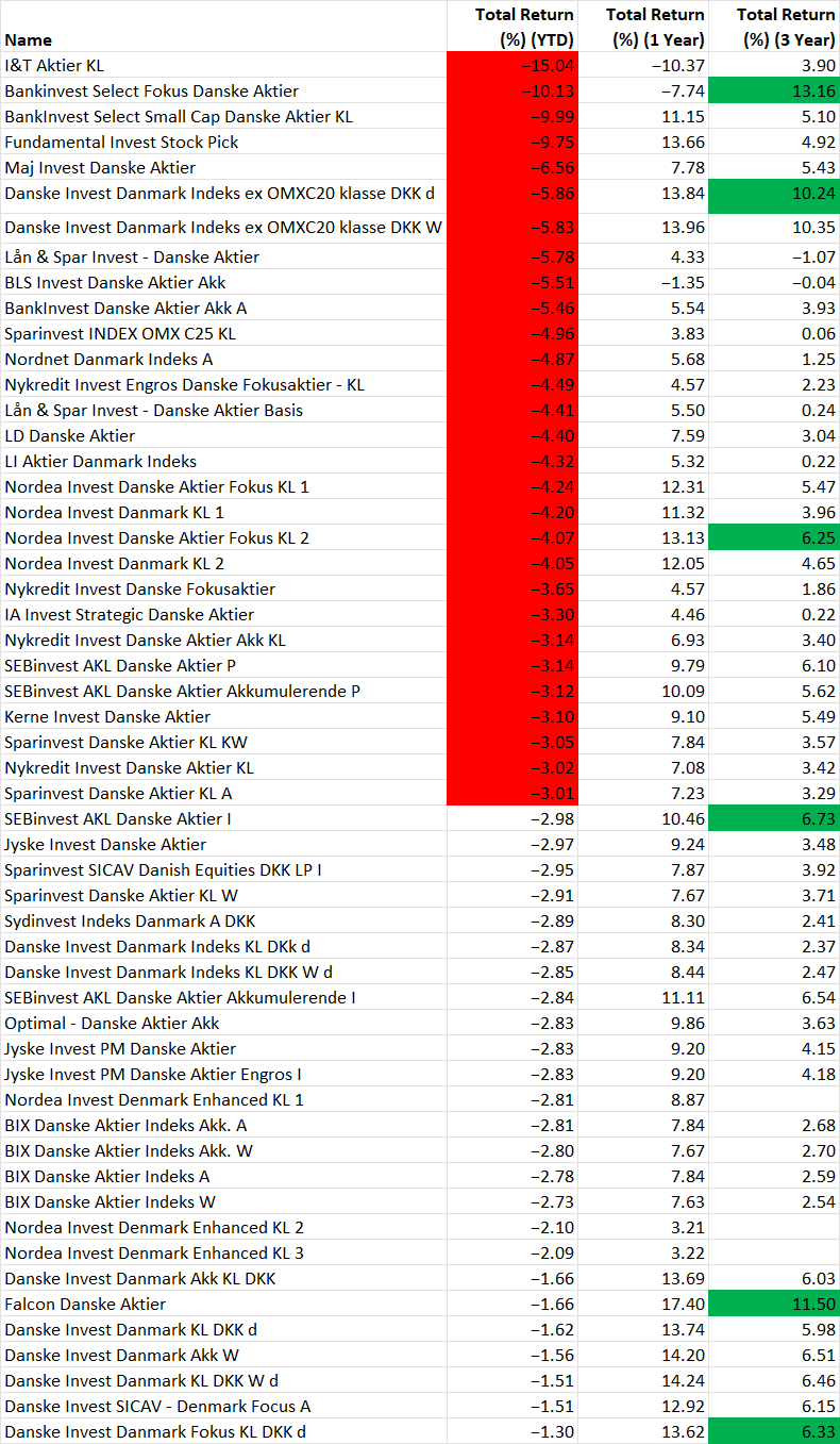 Ifølge Morningstar.dk er der stor spredning i afkast åtd på investeringsforeninger baseret på danske aktier. Bedste afdeling ligger på minus 1,7%, ringeste minus 15%, ØUs forsigtige Portefølje på plus 1,7%.