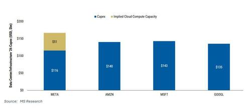 - META expectations for 2026 capex guide for ~120BN as management has said 2026 would be ‘notably larger’ than 2025 where they guided $70-72B. MS analyst notes that META’s off balance sheet leases with GOOGL + CRW+ NBIS types are equivalent to another ~$50B incremental capex so ~$170B theoretical.