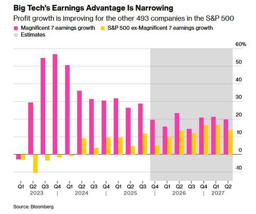 Ahead of tomorrow’s start of Mag 7 earnings season (MSFT, META and TSLA all reporting after the close on Wednesday followed by AAPL on Thursday, representing a total of $10.5 trillion in market cap) Goldman Delta One head Rich Prvorotsky writes that at the end of the day it will all simply boil down to “who is spending less and who is spending more. The bar for numbers feels low given the aggressive starting point of sell tech/sell America/buy everything else.”