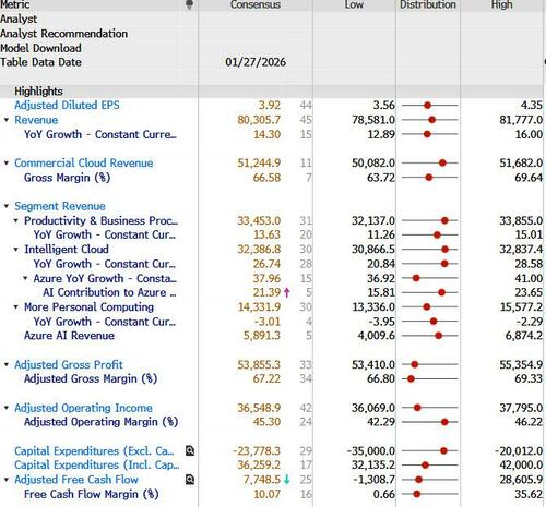 - Azure FXN Revenue Growth: Assuming MSFT puts up +39% Y/Y growth in Q2, investors will want a guide that either explicitly shows Azure accelerating or strongly suggests it, despite the fact that the Street has growth decelerating about -150 bps sequentially. As such, investors believe that the guide needs to be ‘approximately’ +38% Y/Y FXN – perhaps a point higher.