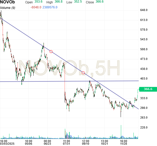Kursgraf: I ØU Forsigtige Portefølje har vi tyve procent af kapitalen i Novo Nordisk. Ved test op mod kurs 390 begynder vi så småt at hjemtage gevinster