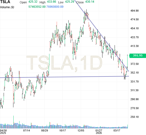 Kursgraf: Efter en større kursnedtur, steg Tesla onsdag hele otte procent. Også lidt i eftermarkedet. Aktien handles dog fortsat til 284 gange 2026-overskuddet og 182 gange 2027-overskuddet, så det er fortsat en aktie for de meget risikovillige