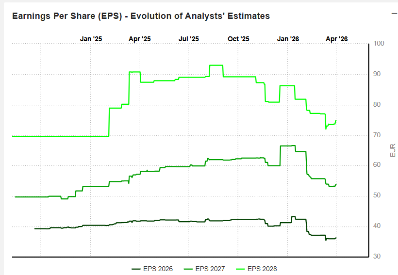 For det andet er analytikerne nu så småt begyndt at opjustere deres estimater for de kommende års EPS-overskud. For 2028 handles aktien nu til moderate 19 gange overskuddet.