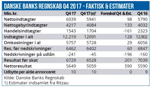 Danske Bank leverede et solidt regnskab for 4. kvartal 2017, som sendte aktien et par procent mere frem end markedet. Især nettorenteindtægter overraskede positivt. CEO Thomas Borgen kører fremad med en øget rentemarginal på erhverv, mens han samtidig skruer ned for risikoen på erhvervsudlån.