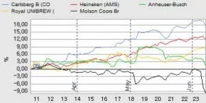 Ser vi helt konkret på nr. 1 og 2. blandt de globale bryggerier – Anheuser-Busch InBev og Heineken – har Carlsberg nu lukket hullet til Heineken, mens Anheuser-InBev fortsat oppebærer en (naturlig) markedslederpræmie i niveauet 10-15%.