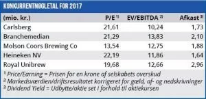 Vores peer-gruppe på 15 selskaber, som så vidt muligt er globale producenter af øl, læskedrikke og øvrige alkoholiske drikke (vin og spritus) viser en P/E-median for 2017 på 21,3 og 19,5 for 2018. Udsvingene fra top til bund er store, men medianen lander ganske tæt på Carlsbergs P/E-multipel på