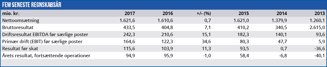 Svaret på spørgsmålet er et klokkeklart nej. Ganske vist har omsætningen været stagnerende de seneste tre år pga. vanskelige markedsforhold i Tyskland og Rusland, og pga et kursfald i det britiske pund, som trækker omsætningen i kroner ned med 48 mio. kr. i 2017. Men den virkeligt interessante linje i regnskabet er det primære driftsresultat (EBIT) før særlige poster, som fortæller en helt anden historie: EBIT er steget markant hvert eneste af de seneste fire år. Senest med 35% i 2017.