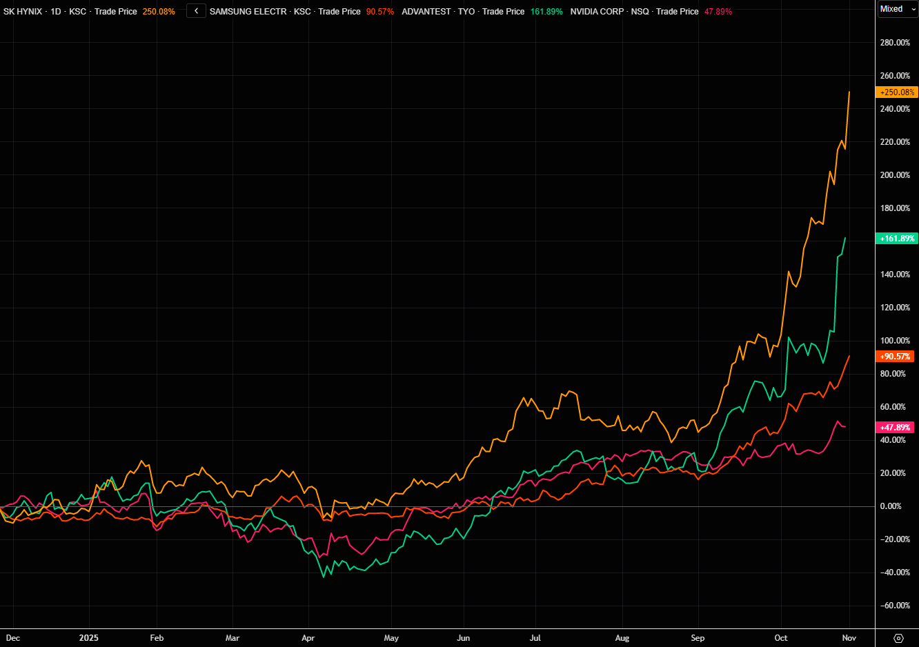 | When NVDA looks “poor” | | Some of the high flying names in Asia have really left NVDA behind. From the top: SK Hynix, Advantest, Samsung electronics, NVDA (% YTD). How does this fit into the “sell narrative”? It is at the very last innings of a bull that the peripheral 2nd derivative proxies go crazy and make even the “core” look normal. | LSEG Workspace |