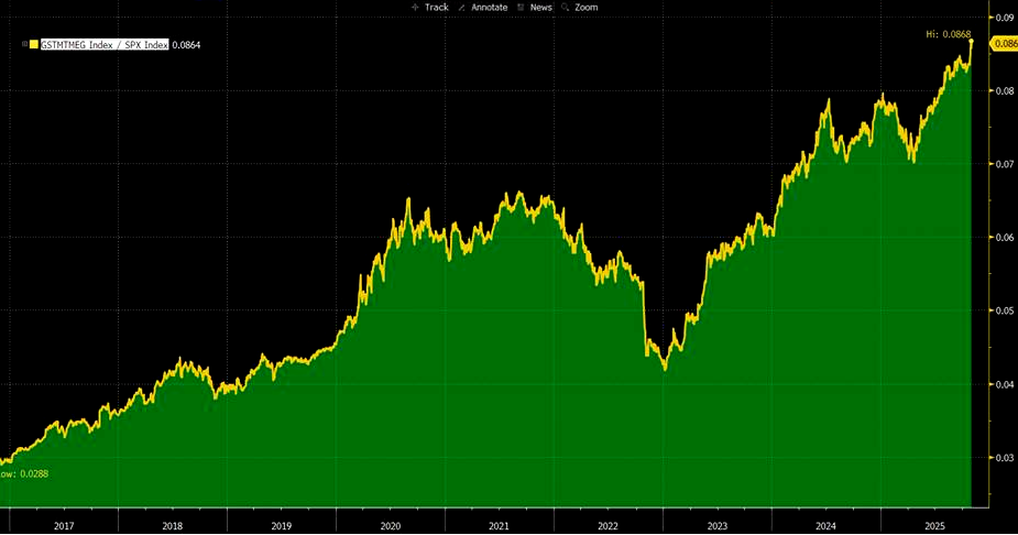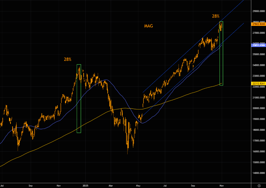 | Need a pause | | MAG has come a long way. Note we are trading close to the upper trend line. Channel lows and the 50 day are way lower… not to mention the 200 day. At the peak of the 2024 melt-up, MAG sat about 28% above its 200-day. We’re right back there again. | LSEG Workspace |