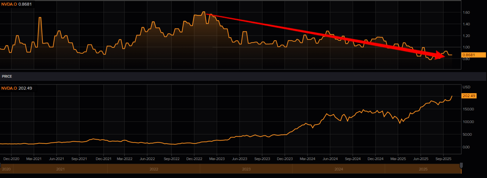 | Extinct | | Shorts in NVDA have been on a steady decline. Chart shows % shares outstanding. | LSEG Workspace |