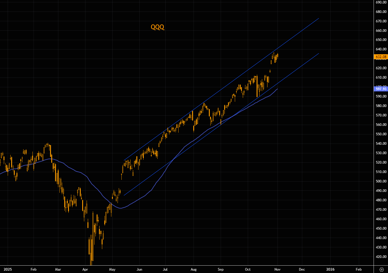 | How to play it via options | | QQQ has traded inside the perfect trend channel since May. We have left the lower part of the channel and the 50 day behind. A 5% pullback and we would still trade just above the 50 day. One way to play a possible move lower is via put spreads. Chart 2 shows the QQQ Jan26 620/590 put spread, around 4.6x max. | LSEG Workspace | LSEG Workspace |