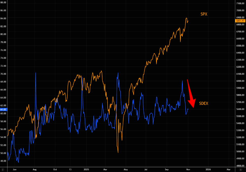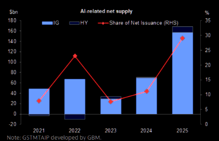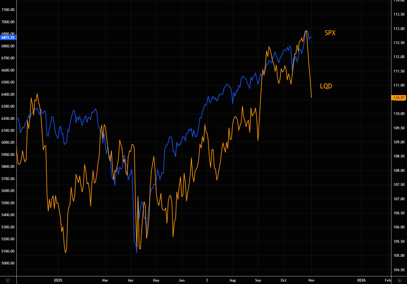 | LQD signals downside | | LQD vs. SPX gap at rather short term wide levels (note LQD went ex div yesterday, but the gap is still worth watching). The sell off in LQD is not due to credit being weaker… this is massive AI supply that needs to be absorbed. | LSEG Workspace | GS |
