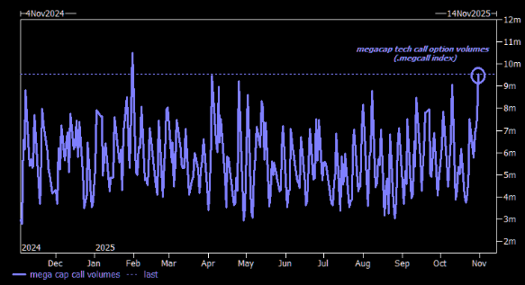 | The view from the options markets | | MAG7 options call volumes exploding to the upside. The only fear is FOMO to the upside. | GS |