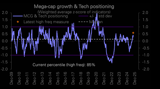| More on positioning | | This chart from Deutsche Bank tracks overall positioning in “Mega-cap growth & Tech”. It is not as high as in 2022 but still, the latest jump (the dot) is taking us to a multi-year high. | Deutsche Bank |