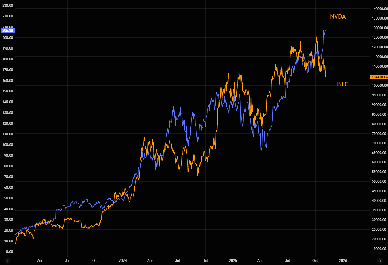 | Bro signals downside | | NVDA and BTC have traded in close tandem for a long time. Driven by the same market psychology? The latest gap has our attention. | LSEG Workspace |