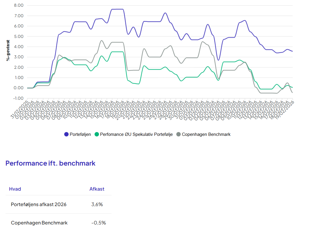 Økonomisk Ugebrevs Forsigtige Portefølje er aktuelt i plus knap fire procent for 2026, mod Copenhagen Benchmark indeks i minus en halv procent.