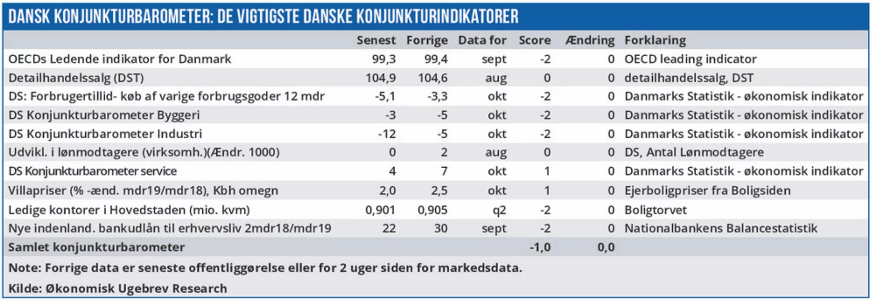 For de øvrige signaler i Økonomisk Ugebrevs Konjunkturbarometer for Dansk Økonomi er der i denne opdatering stilstand på en samlet score på minus 1,0 – i det samlede udfaldsrum mellem minus to og plus to. Særligt bør det bemærkes, at bankernes nyudlån til erhvervslivet er markant lavere end for et år siden.