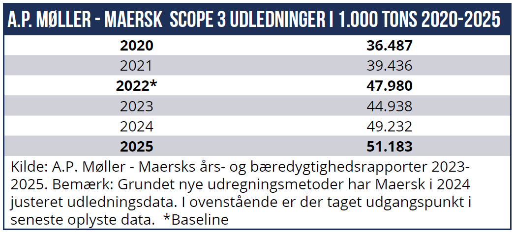 I 2022 leverede Mærsk en rekordomsætning på 81,5 mia. USD. I 2025 var omsætningen faldet til 54 mia. USD, altså et fald på 34 pct. I samme periode steg koncernens samlede scope 1,2 og 3 aftryk fra 82,8 mio. ton CO₂ til 85,5 mio. ton, altså en stigning på 3 pct. Det betyder, at samtidig med at forretningen skrumpede markant, steg klimaaftrykket en smule.