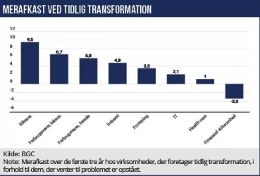 BGC finder i modelberegninger, at timing er den vigtigste faktor for, at en forebyggende transformation kommer til at fungere. Det næstvigtigste er investeringer i forskning, udvikling og kapitalapparatet. Med andre ord – det kan give bagslag, hvis man prøver at fedte sig igennem processen.