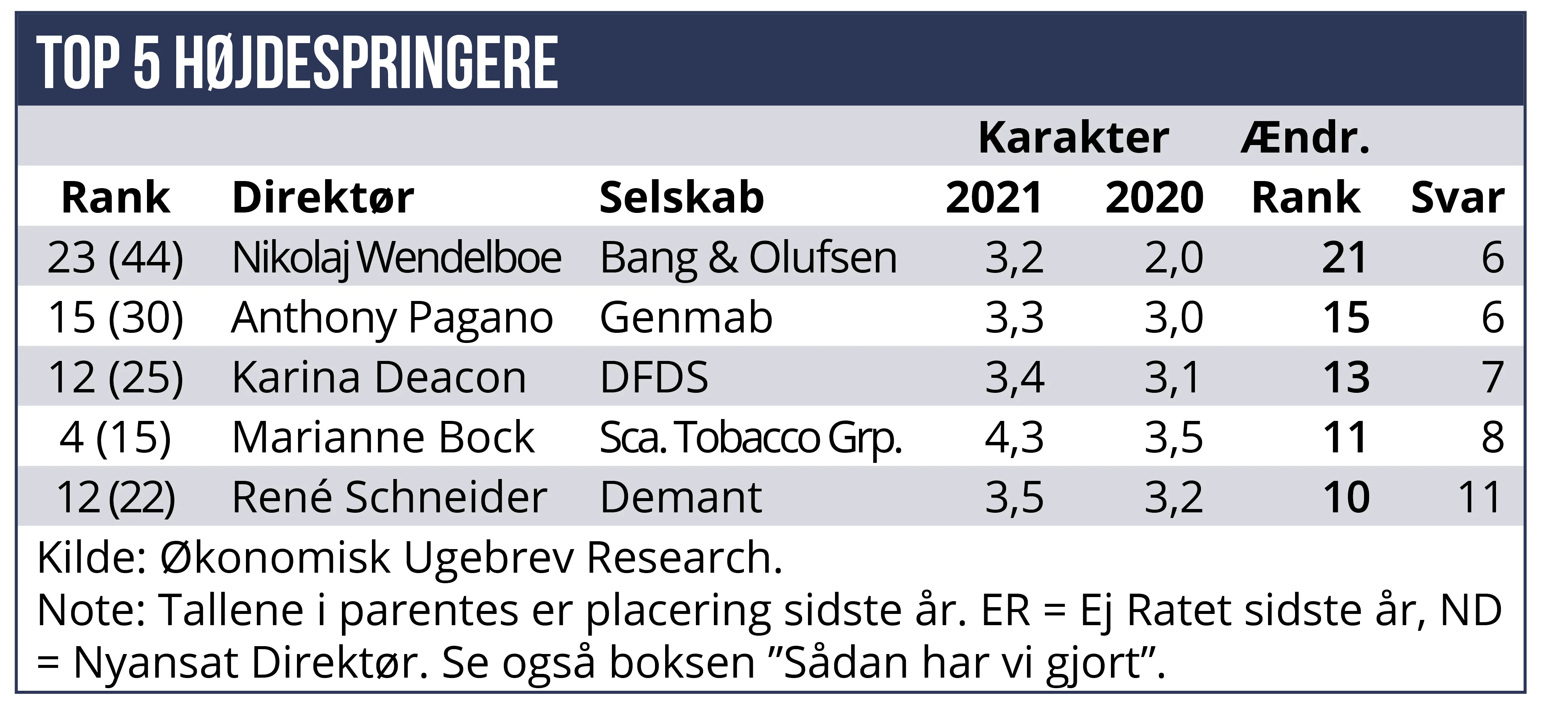 Andre CFO’er med middelmådige karakterer er Stephen Engels fra Danske Bank, der antageligt er ramt af de generelle imageproblemer for Danske Bank, men også analytikerundren over, hvordan den danske storbank skal nå i mål med strategiplanen for 2023. Økonomisk Ugebrev har tidligere sået tvivl om, hvorvidt bankens 2023-målsætning i dag er realistisk. Også den svage kursudvikling i forhold til danske peers understøtter usikkerheden.