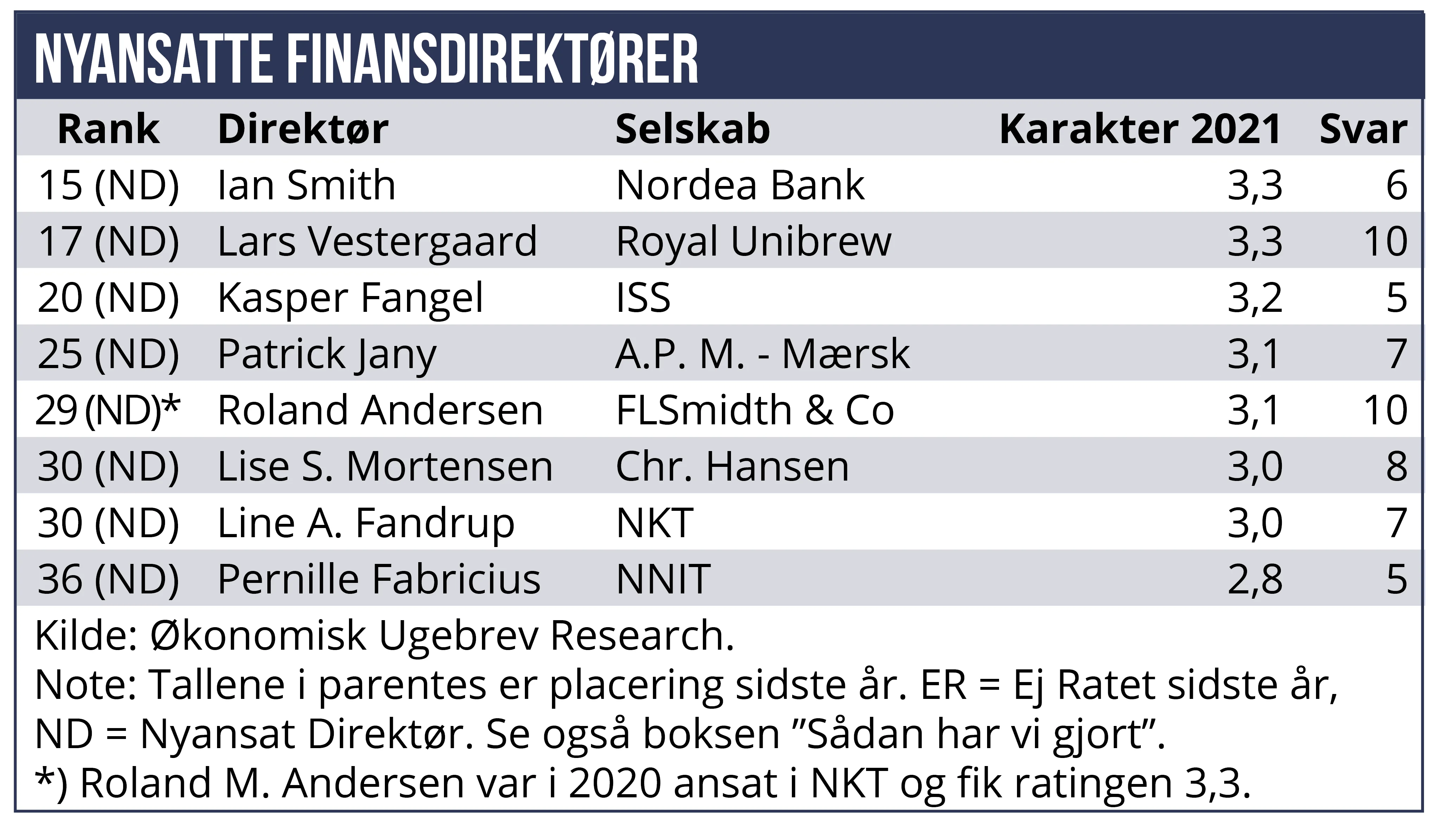 Flere af de nye CFO’er, som ikke var med i sidste års CFO rating, har klaret sig ganske godt. Bedst placerede er Nordeas CFO Ian Smith og Royal Unibrews Lars Westergaard, som begge ryger ind på ranglisten omkring en 15. plads. Kasper Fangel fra Pandora lander på en 20. plads, og Patrick Jany fra A.P. Møller-Mærsk på en 25. plads.