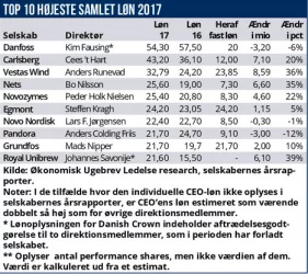 Den nye CEO for Danfoss, Kim Fausing, er i dag Danmarks bedst betalte topchef. Han afløste i juli 2017 Niels B. Christiansen, der sidste eftersommer tiltrådte som topchef for LEGO. Den samlede aflønning for alle topchefer i Top 100 er uændret, men flere af de bedst lønnede fik sidste år markant mere i lønningsposen, også selvom deres præstationer var tvivlsomme.