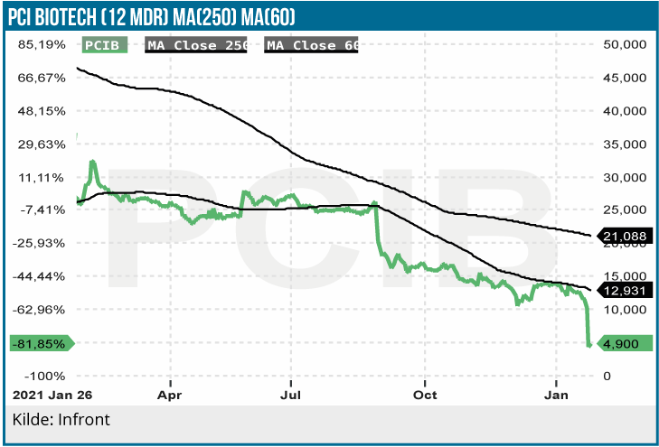 PCI Biotech aktien har været i glidende nedtur det seneste år med et tab på 80 %. Aktiemarkedets tiltro til PCI Biotech og ikke mindst ledelsen kan efter et noget uskønt forløb i det seneste par år nok ligge på et meget lille sted. Spørgsmålet er, om den nuværende ledelse kan blive siddende? Selskabets CEO har haft posten siden 2008 uden at skabe værdi til investorerne eller føre et produkt til markedet. PCI Biotech vil senere komme med nærmere information om strategi og reviderede planer for fremtiden. De skal nok basere sig på et stramt budget, for det virker ikke sandsynligt, at der bliver flere penge at hente fra skuffede investorer på den korte bane.