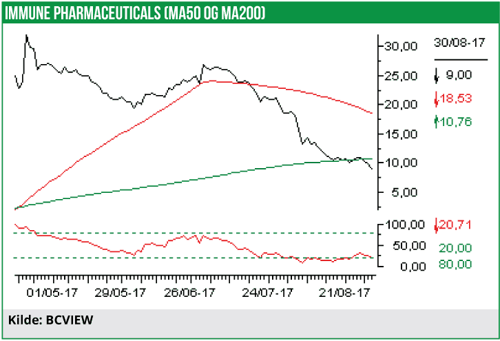 Den 12. april 2017 gennemførte Immune Pharmaceuticals et såkaldt omvendt aktiesplit i forholdet 1:20 for at være i overensstemmelse med den amerikanske Nasdaq Børs regler om en aktiekurs på minimum 1 USD. Den 12. april, dvs. lige efter aktiesplittet var gennemført, lukkede Immune Pharmaceuticals i kurs 25 SEK. Siden er aktiekursen mere eller mindre kollapset og handles nu i kurs 9 SEK. Dvs. et fald på ca. 65% på bare 4-5 måneder. Immune Pharmaceuticals presses blandt andet af en meget usikker økonomisk situation, samt en dårlig likviditet, hvorfor man finansierer den daglige drift gennem udstedelse af aktie-konverterbare obligationer, hvilket har fået det samlede antal udestående aktier i selskabet til at stige voldsomt. Således er aktiekapitalen steget med 429% på blot ét år til nu 9,6 mio. aktier udestående.
