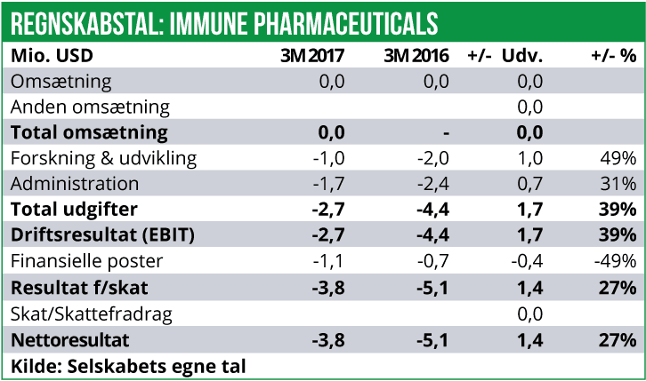 Immune Pharmaceuticals har fortsat ikke fået styr på den finansielle side af forretningen, hvilket betyder, at aktiekursen stadig falder som en sten, trods en pipeline med en vis kvalitet. Siden et omvendt aktiesplit i forholdet 1:20 blev gennemført i april 2017 er aktiekursen faldet med omtrent 65%.