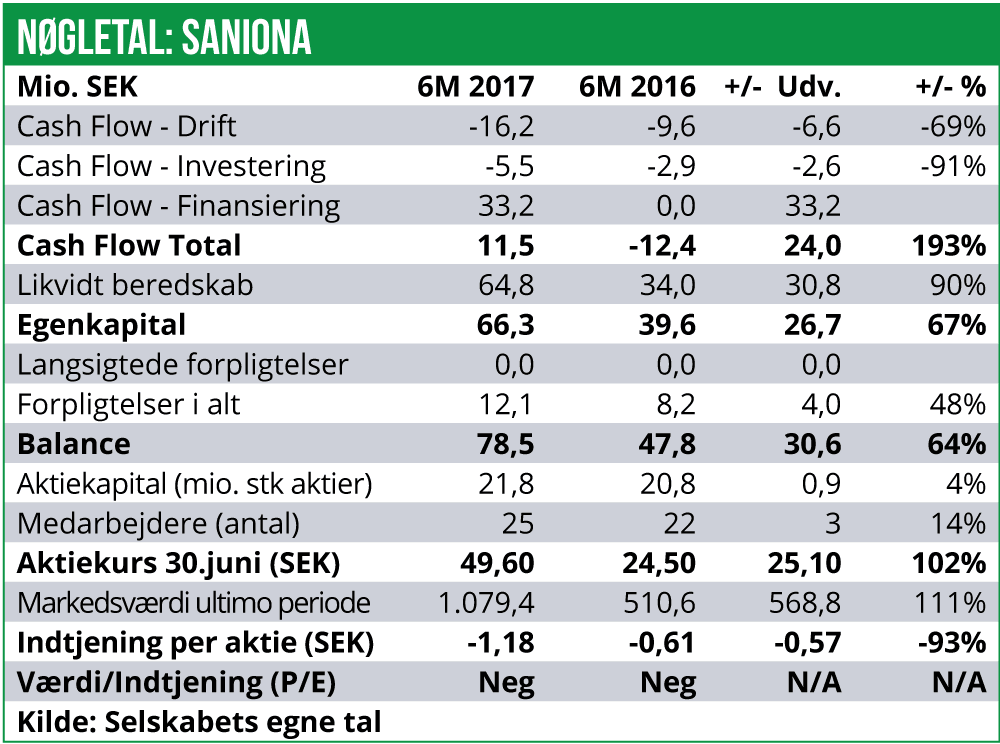 Sanionas regnskab for 1.halvår 2017 viste et EBIT-driftsunderskud på ca. 26 mio. SEK, hvilket er omtrent et dobbelt så stort underskud som i 1.halvår 2016. Den primære årsag er færre indtægter (12 mio. SEK mod 19 mio. SEK året før), samt en stigning i produktion og administrationsomkostninger på ca. 3,5 mio.SEK. Det likvide beredskab per 30.juni 2017 er dog styrket med 90% og stod således i 65 mio. SEK. Vi vurderer at det dette vil være tilstrækkeligt at til sikre driften frem til sommeren 2018.