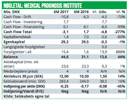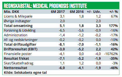 MPI fremlægger kun regnskab per halvår og seneste regnskab dækker således perioden 1.halvår 2017. Indtægtssiden for 1H 2017 er steget væsentligt til 5 mio. DKK mod ca. 2 mio.DKK i 1H 2016. Indtægterne stammer først og fremmest fra licensaftaler med spinoff selskabet Oncology Ventures. MPI’s udgiftsside er dog også steget moderat fra 7 mio. DKK til nu 8 mio. DKK, hvilket har resultatet i et EBIT-resultat på -3 mio. DKK. Det er dog fortsat er forbedring i forhold til underskuddet på 5 mio. DKK i 1H 2016.