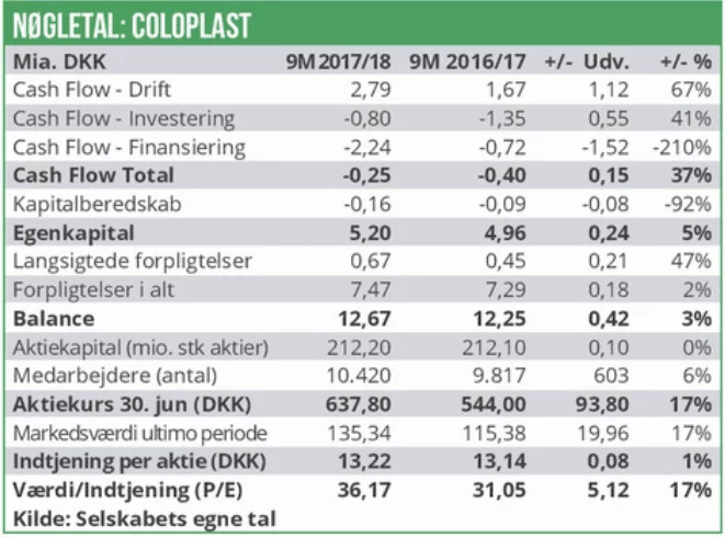 I den forbindelse kan nævnes, at når der korrigeres for udbetaling i forbindelse med amerikanske retssager og køb af virksomheder var Coloplasts frie cash flow på 2.604 mio. DKK efter regnskabs-årets første tre kvartaler stort set uændret i forhold til sidste år. Det giver finansiel styrke til opkøb, eller alternativt udbetaling til aktionærerne i form af udbytte og aktietilbagekøbsprogrammer, indtil en attraktiv opkøbsmulighed viser sig.