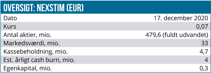 Kassebeholdningen er opgjort til 4,7 mio. EUR, op fra 4,2 mio. EUR ultimo 2019 efter endnu en markant og 86%-udvandende fortegningsemission i juni måned. Udover kassebeholdningen har Nexstim også en rentebærende gæld på 4,7 mio. EUR, hvormed netto-kassepositionen de facto er nul.