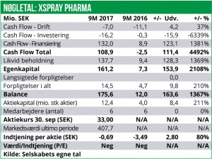 I november fremlagde Xspray Pharma et regnskab for 9M 2017, som viste en solid kassebeholdning på 138 mio. SEK efter IPO’en i slutningen af september 2017. Vi forventer, at den nyligt bebudede rettede emission vil blive fuldtegnet, hvilket vil bringe selskabets nuværende likvide beholdning op omkring 200 mio. SEK. Dette er selvsigt positivt, da dette efter alt at dømme vil sikre selskabets drift de kommende ca. 3 år, dvs. frem til og med 2020. Der vil efterfølgende være knap 14 mio. aktier udestående og med den nuværende aktiekurs i 80 SEK per aktie, modsvarere det en marketcap på ca. 1,1 mia. SEK. Vi kan deraf udleve, at Xspray Pharmas pipeline har en nutidsværdi omkring 0,9 mia. SEK og at aktien handles til 5,5 gange cash.