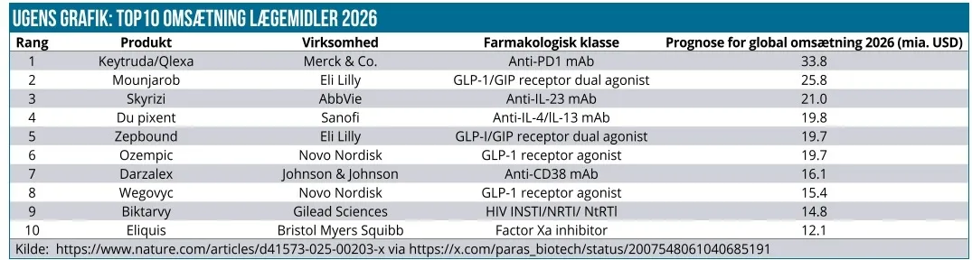 Meget naturligt kigger vi på en prognose for 2026, idet grafikken viser den forventede omsætning fra de 10 største lægemidler i 2026. En omsætning, der samlet løber op i imponerende 198 mia. USD, eller 18 % mere end for den samme top-10 liste sidste år. Der er i øvrigt ikke skiftet ud på listen, men der er dog rykket rundt på enkelte pladser.