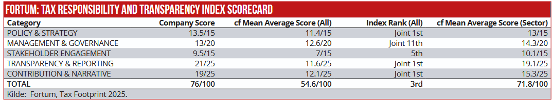 Af Fortums skatterapport fremgår det, at selskabet har opnået 76 ud af 100 point i CSR Europe Tax Responsibility and Transparency Index – hvilket resulterer i en tredjeplads blandt indeksets ratede selskaber.