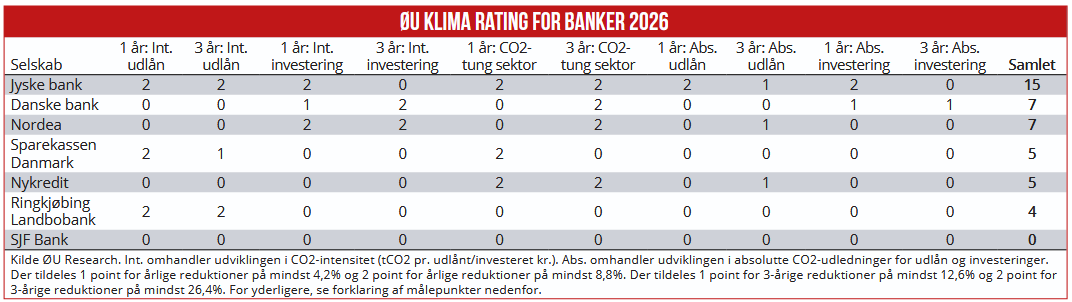 Økonomisk Ugebrev Samfundsansvar har udviklet et rating-redskab, der på baggrund af en række enkle og konkrete målepunkter udpeger hvilke banker, der har de seneste år har skabt de bedste klimaresultater i form af reduktioner af klimaaftrykket fra udlån og investeringer.
