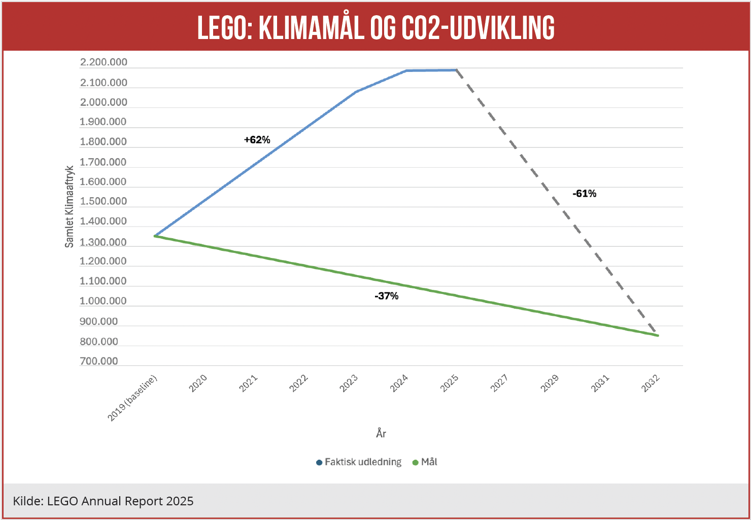 I 2020 forpligtede LEGO sig til at reducere CO2-aftrykket med 37% i 2032, med 2019 som baseline. Siden da er udledningerne kun gået én vej: Op. Ifølge legetøjskoncernens dugfriske årsregnskab var det samlede CO2-aftryk i 2025 på 2,2 millioner ton, mod 1,4 millioner ton i 2019 – altså en stigning på 62%. Økonomisk Ugebrev har stillet LEGO en række spørgsmål om selskabets klimamål og resultater, men de svarer ikke konkret på spørgsmålene, skriver redaktør Claus Strue Frederiksen.