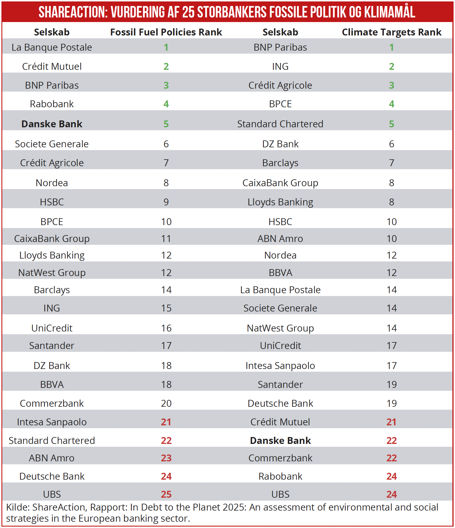 Ifølge en ny rapport fra ngo’en ShareAction har Danske Bank en af branchens mest restriktive politikker i forhold til at yde finansiering til olie- og gassektoren. Ud af de 25 europæiske storbanker, der indgår i undersøgelsen, ligger Dansk Bank nummer fem i kategorien fossile politikker.