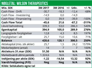 Cash burnet for 1.kvt 2017 var på -46 mio. SEK, hvilket efterlod Wilson Therapeutics med et fortsat ganske solidt kapitalberedskab på 339 mio. SEK ved udgangen af marts 2017.