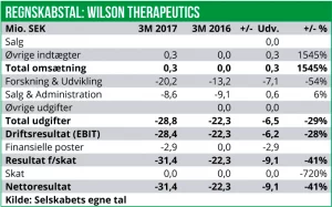 Wilson Therapeutics regnskab for 1.kvartal 2017 blev fremlagt d. 17. maj. Ganske som ventet er underskuddet stigende som følge af udviklingen af WTX101. R&D udgifterne er steget med 54% til 20 mio. SEK, mens administrationsomkostninger faktisk er reduceret med 6% til 9 mio. SEK. Underskuddet efter skat er vokset med 41% til -31 mio. SEK.